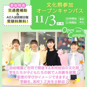11月3日(月祝)文化祭特別オープンキャンパス 10時開始/11時開始 1年生が子どもたちの前で人形劇を披露♪ 聖徳の学びをイメージできますよ!